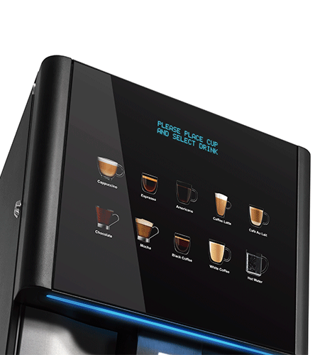 The user display, together with the cup positioning lighting system and intuitive tray position, guides the user through a simple and pleasing experience, every time they order a drink.